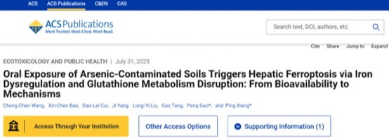 我院修复生态团队王成尘博士为论文第一作者,向萍研究员为最后通讯作者,在生态环境领域权威杂志Environmental Science & Technology(IF=11.3,Nature指数期刊)发表最新研究成果,并被选为期刊的副封面(supplementary cover)文章。无意中从受污染的矿区土壤摄入砷(As)会对健康构成重大威胁,特别是对肝功能方面的影响。虽然砷诱导的肝毒性已被报道,但经口摄入暴露与肝损伤之间的影响机制仍然知之甚少。在这项研究中,我们通过体外胃肠模拟法测定砷的生物可给性,...