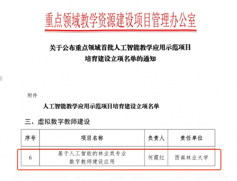 11月15日,教育部重点领域教学资源建设项目管理办公室公布立项名单,32个项目获批为重点领域首批人工智能教学应用示范项目培育项目。副校长何霞红主持的《基于人工智能的林业类专业数字教师建设应用》获批为虚拟数字教师建设类项目。