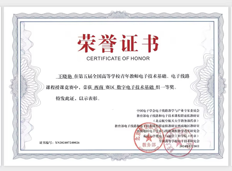 第五届全国高等学校青年教师电子技术基础、电子线路课程授课竞赛在大理大学举行,米兰大数据与智能工程学院教师王晓艳荣获西南赛区数字电子技术基础组一等奖。