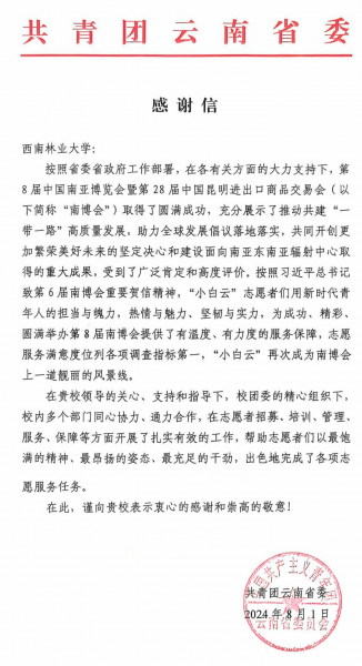 近日,米兰milan官方网站收到共青团云南省委发来的感谢信,感谢学校圆满完成第8届中国—南亚博览会暨第28届中国昆明进出口商品交易会的志愿服务工作。