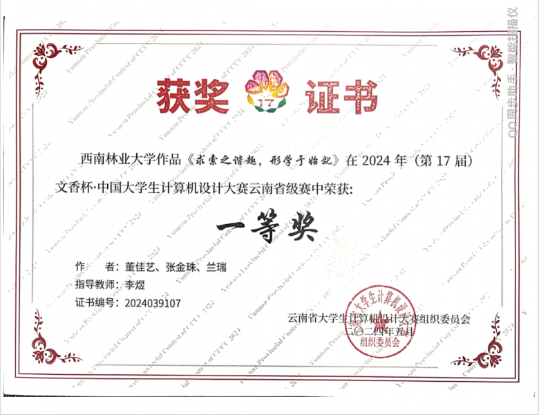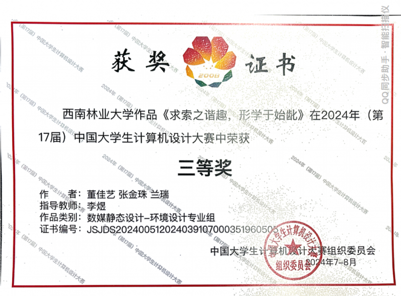 近日,2024年第17届中国大学生计算机设计大赛落下帷幕。由米兰园林园艺学院教师李煜指导学生董佳艺、张金珠、兰瑞的参赛作品《求索之谐趣,形学于始龀》,先后获得数媒静态设计环境设计专业组校赛二等奖、省赛一等奖,并最终在国赛中荣获三等奖。