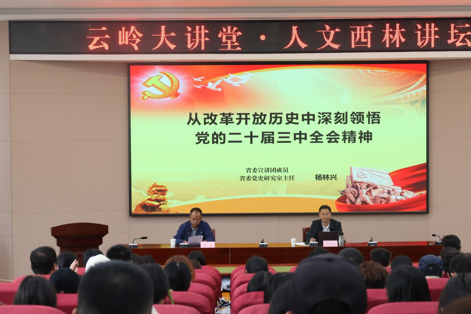 为学习贯彻党的二十届三中全会精神,9月12日,“云岭大讲堂·人文西林讲坛”邀请中共云南省委党史研究室主任杨林兴研究员到校进行主讲。本次讲座由学校党委副书记魏宏主持,200名师生代表聆听讲座。