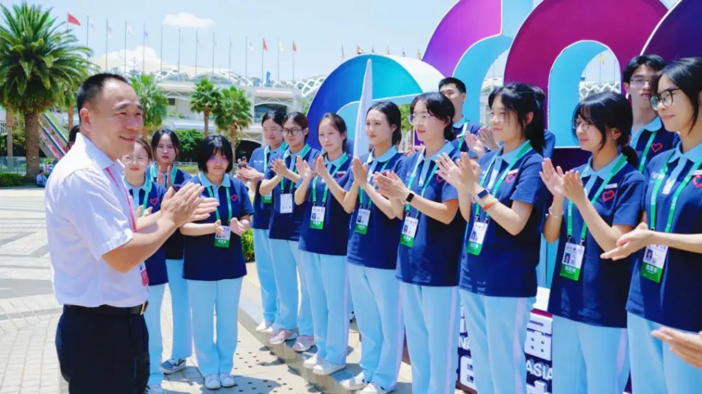 郭华向全体志愿者致以亲切的问候,并高度赞扬了他们无私奉献的志愿服务精神。同时,他对辛勤付出的志愿者们寄予三点希望。一是希望全体志愿者坚守岗位,将安全视为工作的基石,服从指挥,以坚定的政治责任感和行动执行力,确保志愿服务工作圆满完成。二是希望全体志愿者借此次盛会之机,拓宽国际视野,深入社会实践,增进对国情的深刻理解,以实际行动诠释新时代大学生勇于担当、乐于奉献的青春形象。三是希望全体志愿者将每一次服务都视为成长的契机,让青春在南博会的广阔舞台上绚丽绽放,用实际行动书写属于自己的价值篇章。