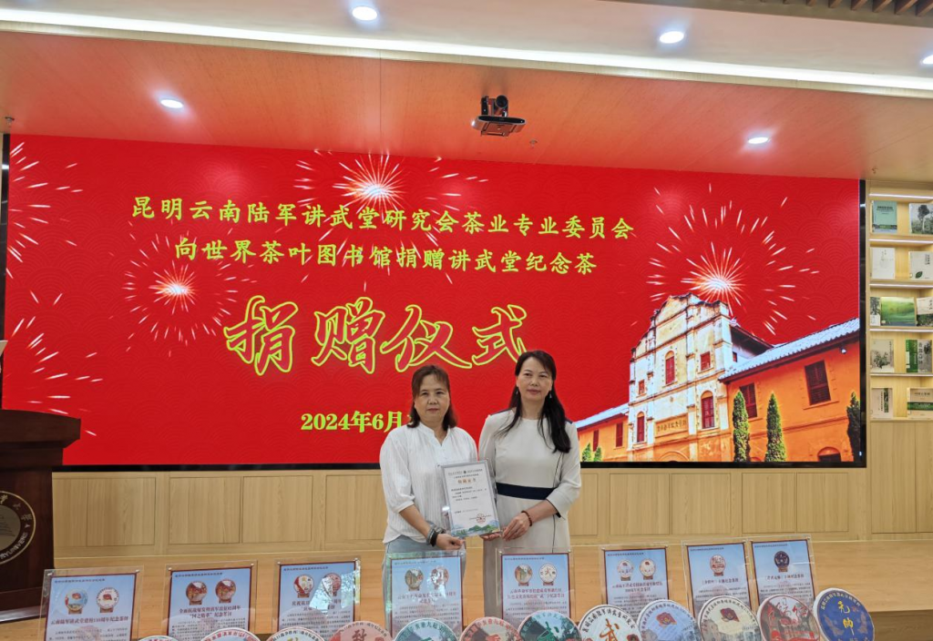 捐赠仪式上,研究会向世界茶叶图书馆捐赠包括“云南陆军讲武堂建校110周年纪念茶饼”“全面抗战爆发暨滇军出征85周年’国之精萃’纪念茶饼”等讲武堂纪念茶两套共28片。万晓虹代表世界茶叶图书馆向研究会颁发世界茶叶图书馆云茶档案基收藏证书。
