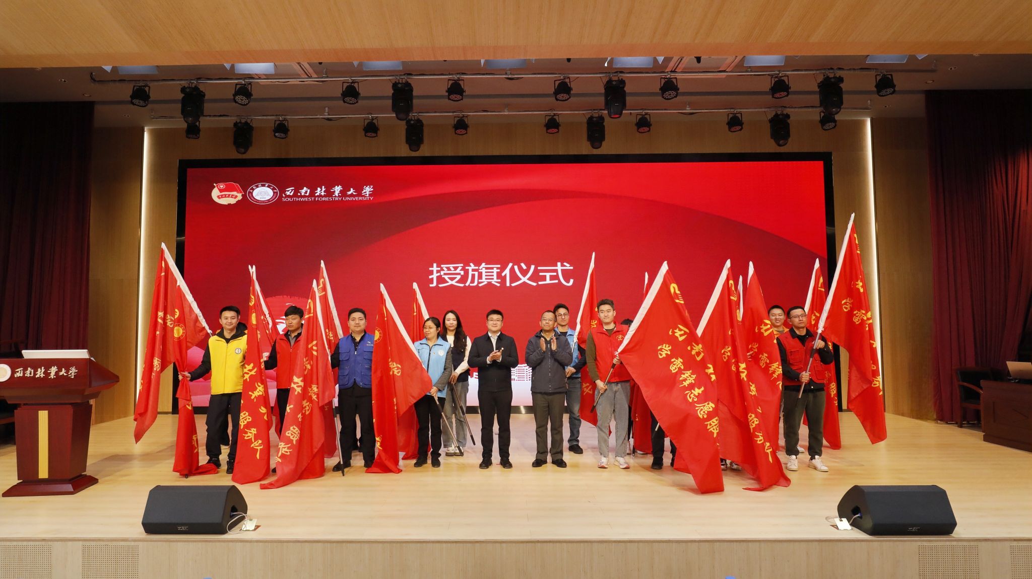仪式最后,郑茗戈与魏宏共同为16个学院志愿服务队和职能部门党员先锋队授旗。(来源:团委/文:陈远书/图:张冉/审核:左智凯/初审:张冉/复审:冷瑾/终审:张武先,柏顺文)