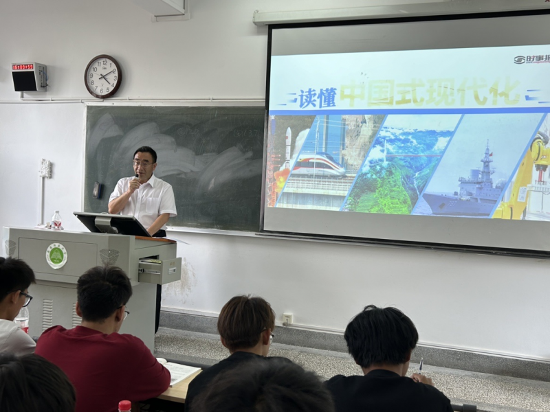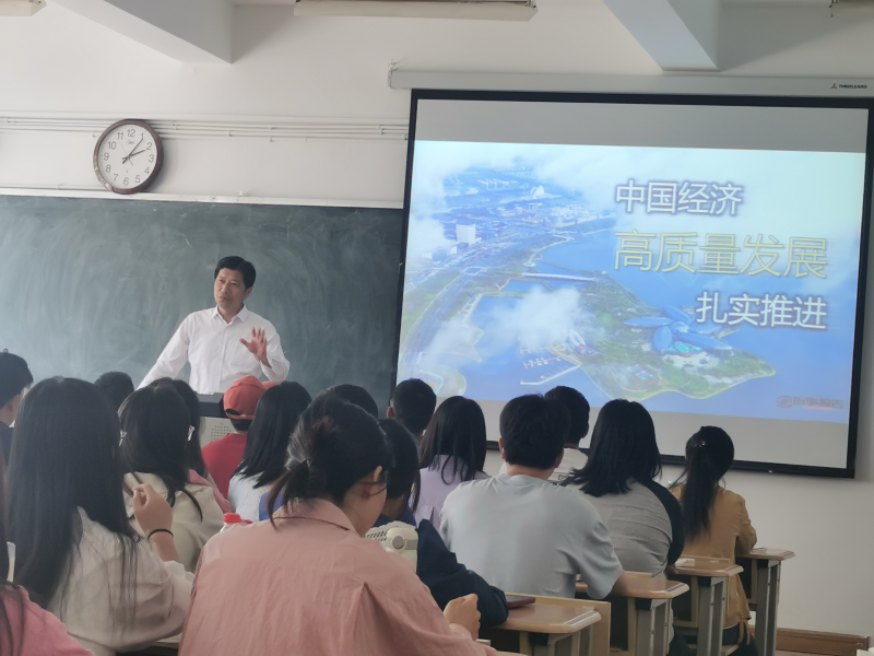校党委书记李永勤以《中国经济高质量发展扎实推进》为题,从“回升向好韧性强”“全面长远辩证看”“多措并举提质量”三个方面对中国经济高质量发展进行全面系统分析。教学过程中,李永勤和同学进行交流互动,带领同学们回望2023年,思考后疫情时代的中国答卷,感悟中国力量和中国精神,激励青年学生培育家国情怀、强化责任担当、增强报国本领、学会理性思考,努力肩负起时代重任,把握当下,在奋斗中与祖国一起茁壮成长。