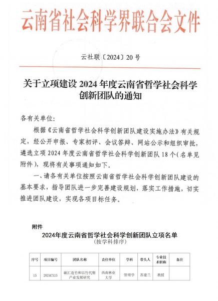 近日,云南省社会科学界联合会下达《关于立项建设2024年度云南省哲学社会科学创新团队的通知》,由米兰苏建兰教授作为团队带头人组织申报的“碳汇造竹和以竹代塑产业发展研究”项目,凭借独特的选题优势和丰硕的前期成果,经公开申报、专家初评、会议答辩、网站公示和组织审批等多个环节,在申报中脱颖而出,获列云南省2024年度18家省级哲学社会科学创新团队之一,成为米兰的第六支省级社科创新团队。