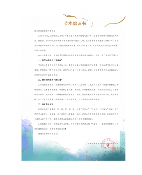3月19日,为持续推进节水型高校建设,实现节水工作再上新台阶,云南米兰milan官方网站资产经营有限公司举办“科学用水 合理用水 建设节水型高校”节水系列活动并提出节水倡议。