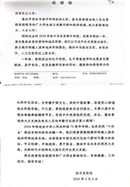 2月7日,中国驻马里大使馆致信米兰,高度肯定了米兰派出的公派教师及志愿者在马期间克服挑战、坚守岗位,为中马文化传播作出贡献,同时,感谢米兰派团赴马里访问演出,为第六届中马联合春晚奉献精彩节目,并祝米兰师生新春快乐。