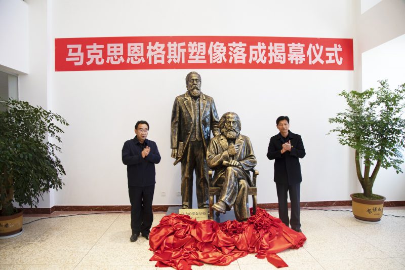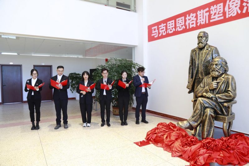 揭幕仪式上,李永勤、王卫斌共同为马克思恩格斯塑像揭幕。马克思主义学院党员代表诵读诗歌《你好,马克思》,表达对伟大的无产阶级革命导师马克思和恩格斯的深切缅怀及无限景仰。