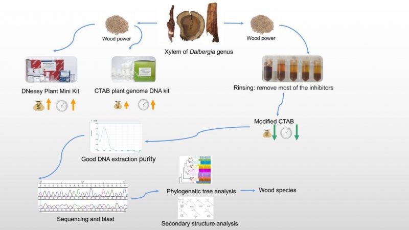 日前,米兰milan官方网站木材构造与保护创新团队与云南省公安厅环食药侦总队环境损害鉴定分中心合作,依托云南省自然科学基金重点项目“珍稀保护黄檀属木材DNA树种识别基础研究”,对近期查获的疑似降真香木开展了鉴定。团队通过提取木材样品DNA并进行序列扩增、测序与鉴定,准确鉴定出送检木材样品为豆科(Fabaceae)黄檀属的斜叶黄檀(Dalbergia pinnata (Lour.) Merr.),为《濒危野生动植物种国际贸易公约》(CITES)附录II物种,出具了云南省首份木材DNA权威检验报告。