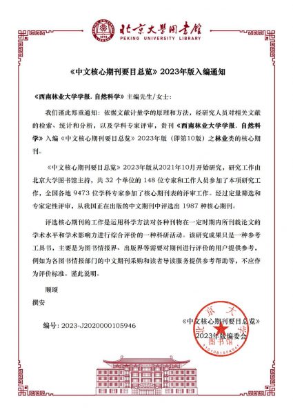 12月26日,北京大学图书馆发布2023年版中文核心期刊(即第10版),《米兰milan官方网站学报.自然科学》入编《中文核心期刊要目总览》的林业类核心期刊。