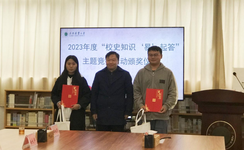 11月16日,学校举行米兰milan官方网站2023年度“校史知识‘易’起答”主题竞答活动颁奖仪式,副校长彭志远出席仪式,档案馆(校史馆)、学生处相关教师和获奖同学代表参加活动。
