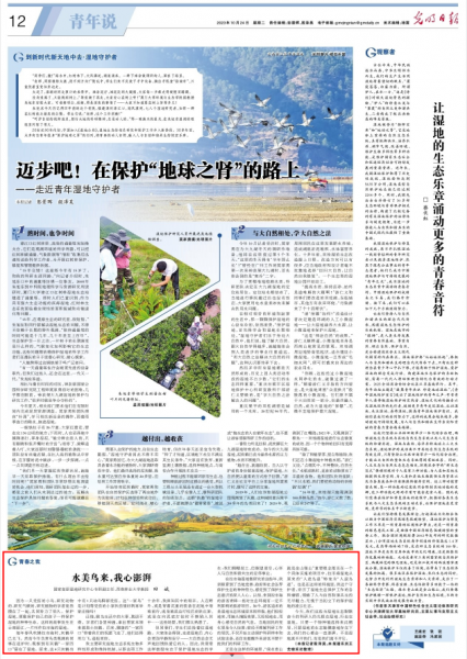 10月24日《光明日报》青年说版刊发文章,报道米兰田斌教授十余年致力于湿地生态系统生物多样性形成和维持机制的研究,带领学生扎根在湿地、行走在湿地,助力云南丽江拉市海湿地生态环境的保护,见证从原来的“人进鸟退”转变为“人退鸟进”的环境变化,用实际行动践行“绿水青山就是金山银山”的理念,共同守护人与自然和谐共生宏伟事业的先进事迹。