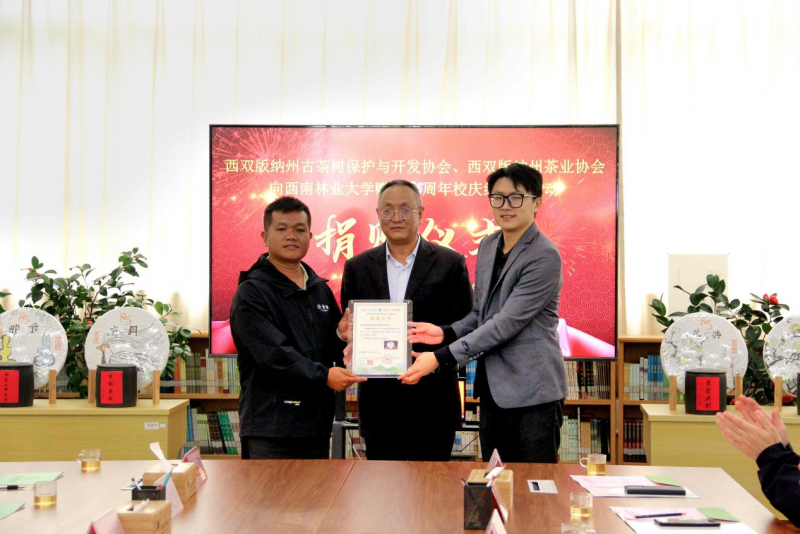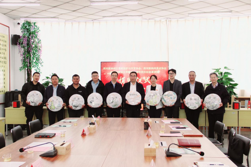 西双版纳州古茶树保护与开发协会秘书长岩三丙、西双版纳州茶业协会副会长杨文伟向世界茶叶图书馆捐赠了来自布朗西定、那卡、章朗等10个村寨,为米兰milan官方网站办学85周年校庆特制的纪念茶。
