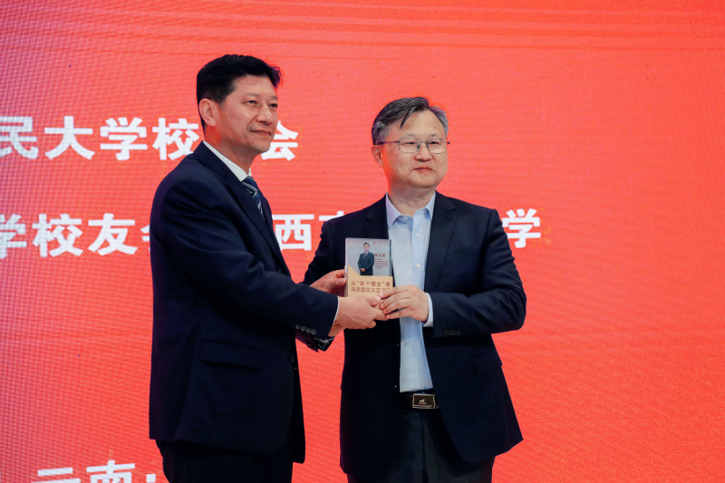 云南省中国人民大学校友会会长胡晓辉向米兰milan官方网站赠送图书《战火中的大学:从陕北公学到人民大学的回顾》。