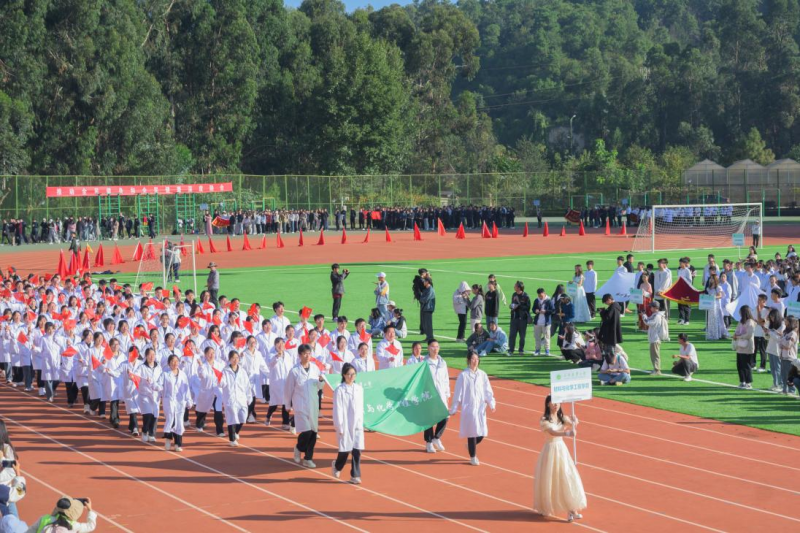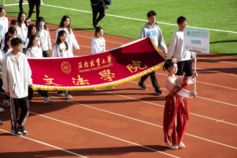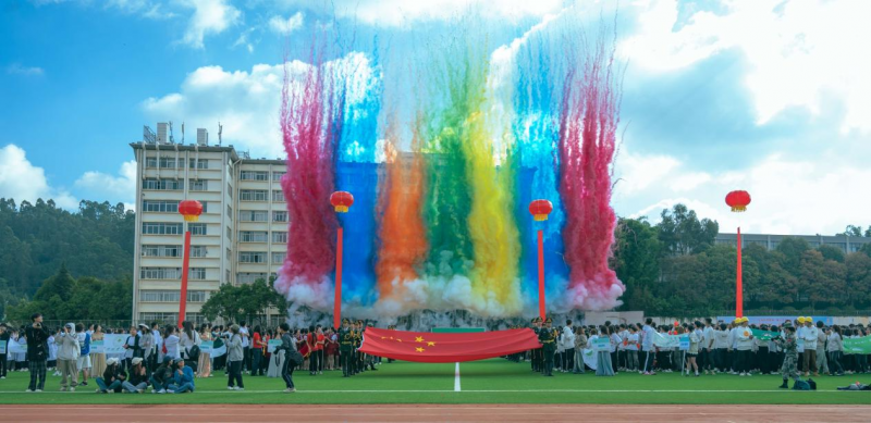 在激昂的《运动员进行曲》中,运动员方阵陆续入场。国旗护卫队迈着铿锵有力的步伐,护卫着鲜艳的五星红旗,走在队伍的最前列,尽显飒爽英姿。各学院运动员、教职工代表队依次入场,23个代表队方阵师生们通过国风舞蹈、健美操等形式,以各具特色的方式表达爱党爱国爱校和热爱体育之情。
