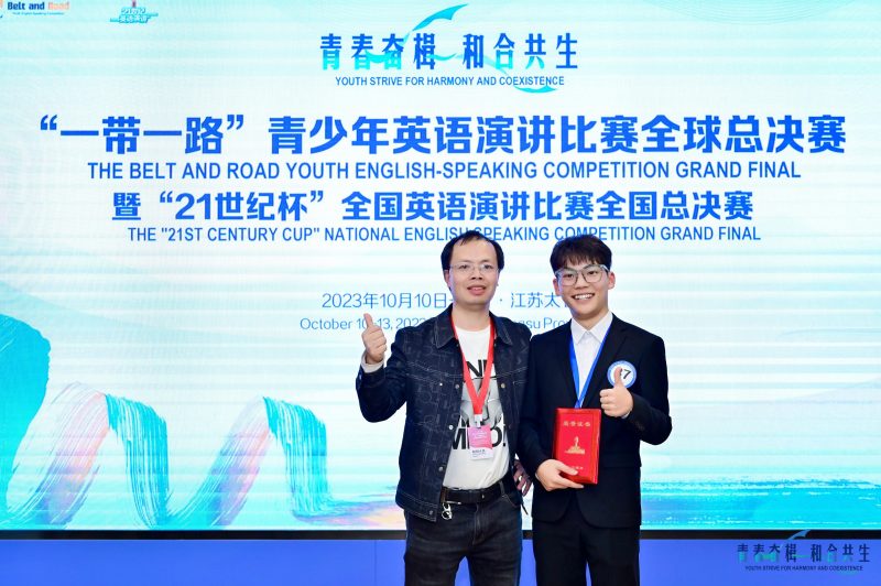 在外国语学院教师万成宾指导下,姜景耀同学以杭州亚运会及中国在国际社会中发挥的作用为演讲题目,声情并茂地展示了当代大学生的家国情怀。