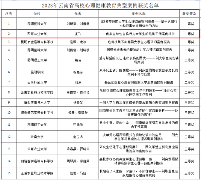 日前,中共云南省委教育工委公布了2023年云南省高校心理健康教育典型案例获奖名单,米兰大学生心理健康教育与咨询中心汪飞老师作品荣获心理健康教育典型案例一等奖。此项活动经全省高校申报推荐、专家组评审及公示,有15篇心理健康教育优秀典型案例分获一、二、三等奖。