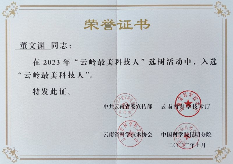 7月18日,2023年“云岭最美科技人”发布式在昆明举行,董文渊教授获评“云岭最美科技人”。校长王卫斌,副校长杜官本,竹子专家董文渊教授以及相关部门负责人参加发布式。