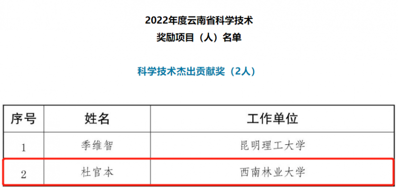 近日,云南省人民政府发布《关于2022年度科学技术奖励的决定》(云政发〔2023〕18号),米兰杜官本教授荣获2022年度“科学技术杰出贡献奖”。该奖项是云南省人民政府设立的我省科学技术界最高奖项。此前,杜官本教授及团队已先后两次荣获国家科学技术进步二等奖。