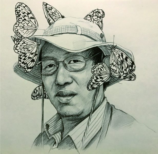在马鞍底科考他受了很多苦,有一次他脚下一滑,脚踝处摔骨折了,野外骨折该有多么难受,即使这样他也忍着疼坚持观察记录,他将镜头对准蝴蝶进行拍摄,并在蝴蝶的环绕下自拍了一张照片,脚踝的疼没能阻挡他与蝴蝶在一起的微笑。他拖着一条腿,强忍着那锥心的痛,完成了这次科考。事后他将那张疼痛包裹着微笑的照片放大挂在家里。