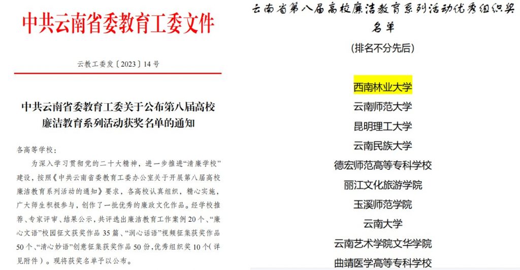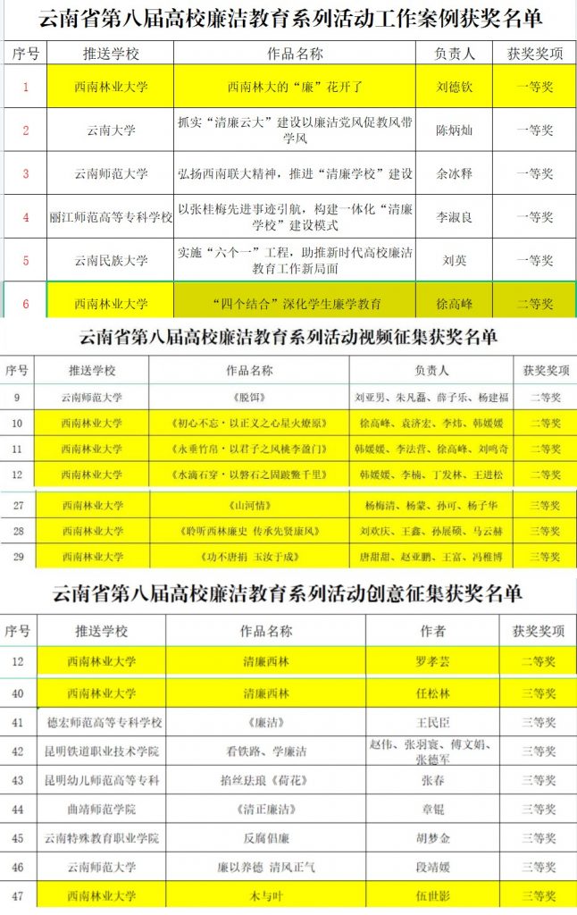 近日,中共云南省委教育工委公布第八届高校廉洁教育系列活动获奖名单,米兰共11部作品获奖,其中《西南林大的“廉”花开了》获“教育工作案例”一等奖并选送参加全国集中展示,《“四个结合”深化学生廉学教育》获“教育工作案例”二等奖;《初心不忘·以正义之心星火燎原》《永垂竹帛・以君子之风桃李盈门》《水滴石穿・以磐石之固跛鳖千里》3部作品获“润心话语”视频二等奖,《山河情》《聆听西林廉史 传承先贤康风》《功不唐捐 玉汝于成》3部作品获“润心话语”视频三等奖;《清廉西林》(罗孝芸)获“清心妙语”创意征集二等奖,《清廉西林》(任松林)、《木与叶》2部作品获“清心妙语”创意征集三等奖,同时米兰荣获“优秀组织奖”。