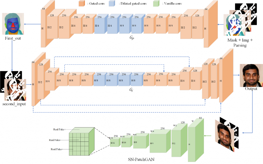 人脸图像补全是图像修复的一个特定领域,它可以应用于许多与人脸相关的实际应用中,对其进行研究具有重要价值。具体的人脸图像补全是对破碎或遮挡的不完整人脸图像进行补全,主要是通过整张人脸图片的语义信息来生成相似的人脸图像。传统的图像补全方法不具有捕捉高级语义的能力,很难实现具有明显语义信息的人脸补全任务。基于深度学习的补全模型能够提取并学习图像深层信息,从而能够对缺失的人脸图像进行补全。即便是基于深度学习的补全方法,对不完整人脸补全时,会出现不合理的补全结果,或是补全的人脸图像在五官结构上会有不连续的情况。