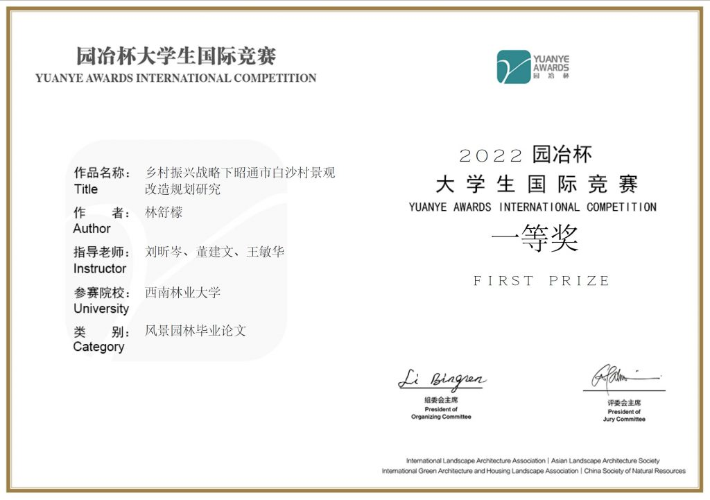 近日,园林园艺学院园林2018级学生林舒檬的参赛作品“乡村振兴战略下昭通市白沙村景观改造规划研究”在第十三届园冶杯大学生国际竞赛荣获一等奖,该作品由刘昕岑、董建文、王敏华指导,刘昕岑老师获“优秀指导教师”称号。
