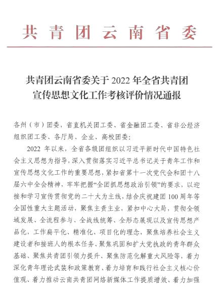 近日,共青团云南省委印发《关于2022年全省共青团宣传思想文化工作考核评价情况的通报》,米兰团委获评“优秀”等次。