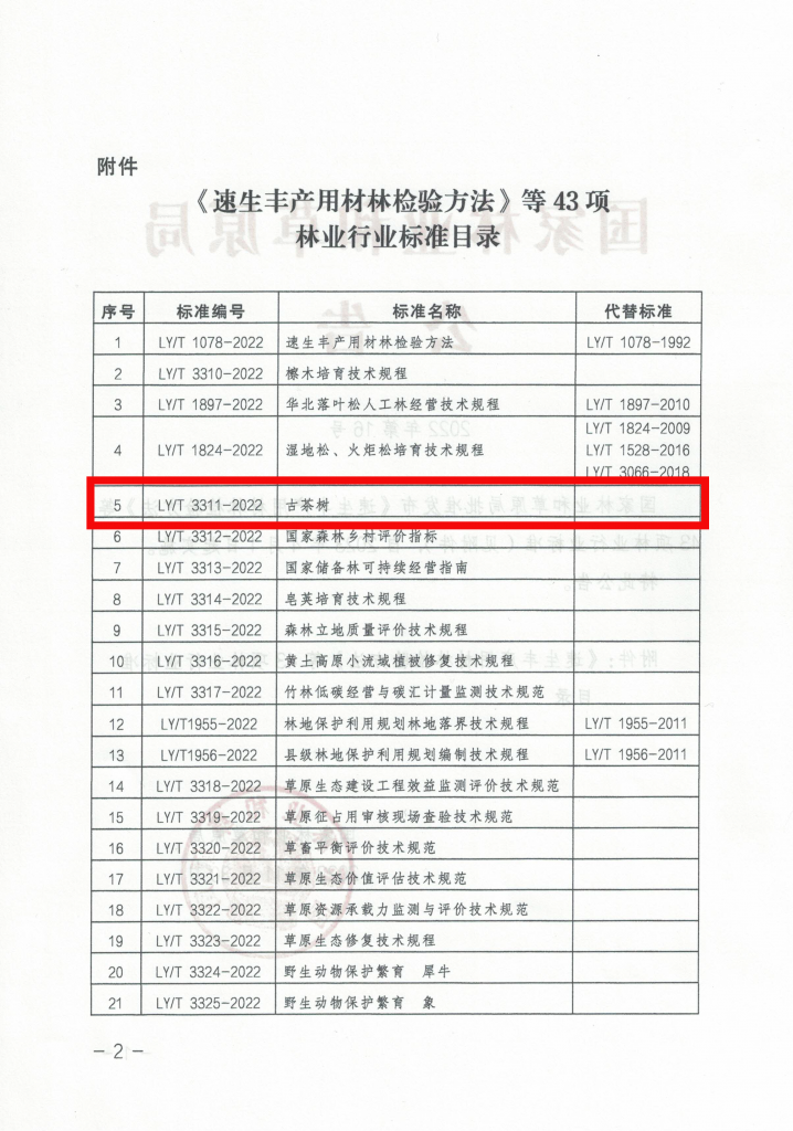 由米兰milan官方网站牵头,国内十余家单位参与编制的《古茶树》(LY/T 3311-2022)行业标准,通过了国家林业和草原局组织的专家审定,并于国家林业和草原局发布2022年第16号公告,标准将于2023年4月1日实施。