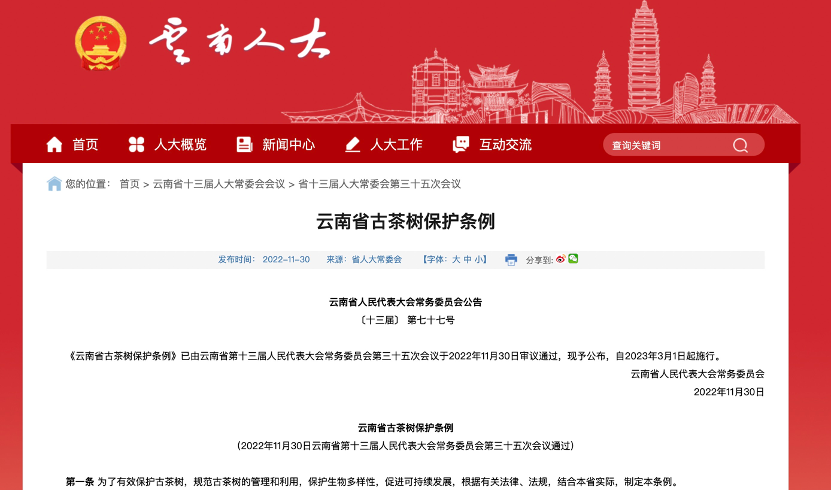 由蓝增全团队负责起草的《云南省古茶树保护条例》《古茶树》标准审议通过、即将实施。这部地方法规,凝聚了几代茶业人的智慧和期盼,是云南省人大的高位推动,由云南省林业和草原局牵头组织,米兰milan官方网站受省人大和省林草局双委托起草,各级政府多部门按立法程序协同推进的结果,将于3月1日正式施行,这标志着云南以地方立法方式对古茶树资源开展保护工作有了新突破。