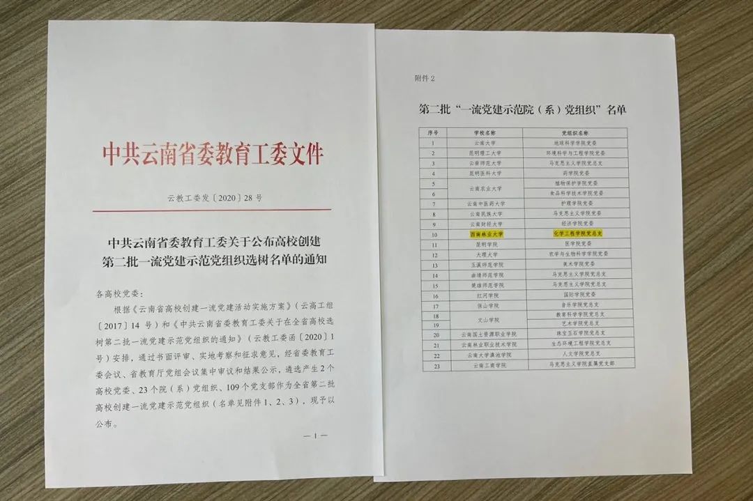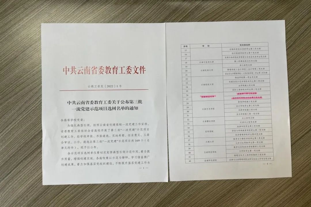学校党委坚持党的教育方针,不断强化中国特色社会主义大学的政治属性,强化顶层设计,树立大抓基层的鲜明导向,通过基层党建提升年、基层党建巩固年、基层党建创新提质年及“智慧党建三年行动计划”,切实加强基层党组织建设。着力选优配强基层党务干部,强化教师党支部书记“双带头人”教师党支部书记示范导向,实现27个“双带头人”全覆盖。开展支部分类定级、对标争先、样板及示范点创建、基层联建共建、“一院一品”品牌创建等,学校144个支部建设全部达标,先后获全国党建工作样板支部3个、云南省创建一流党建示范院(系)党组织3个、省级“规范化建设示范党支部”1个、创建一流党建示范党支部8个、党建示范项目2个、“双带头人”教师党支部工作室1个。