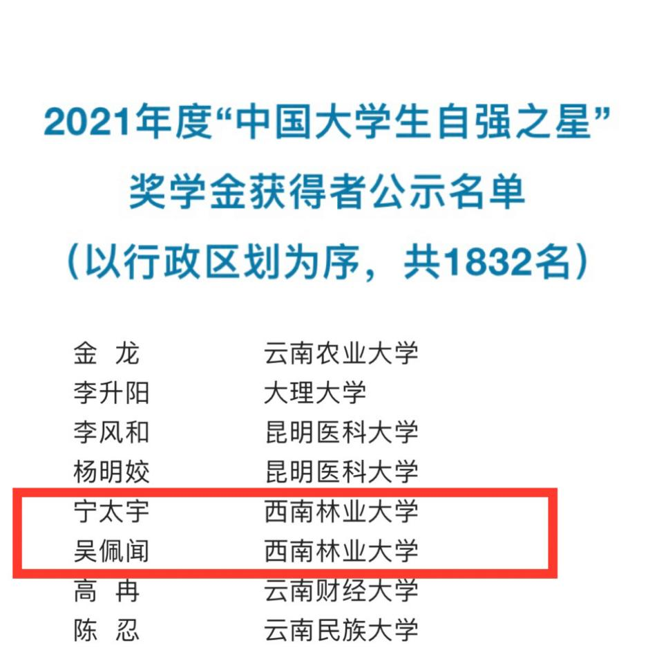宁太宇是云南省优秀大学生、云南省百名大学生自强之星、云南省优秀学生干部;主持国家级大学生创新创业项目1项已结题,荣获优秀省级项目1项,发表学术论文8篇,EI检索2篇,一作4篇,申请专利4项。吴佩闻在学校积极参加志愿活动,自愿成为志愿者,加入了“西畴县战‘疫’小分队”,成为了一名抗疫志愿者,寒冬腊月中挨家挨户排查,核酸采样点上坚守岗位。