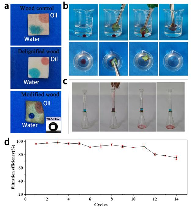 本文进一步确定了改性轻木表面构成,发现改性木材表面被四面体颗粒覆盖,通过XRD、XPS表征分析证明表面颗粒为Na3(Cu2(CO3)3OH)·4H2O,这些颗粒在木材表面构建了理想的微纳结构;浸渍硬脂酸显著降低了改性轻木表面自由能,此两者相互作用,使改性轻木具有了超疏水-亲油功能。本工作中所用木材原料是可再生的,且经济有效,改性过程简单节能,最终产品对环境友好,符合国家生态文明建设、美丽中国和绿色发展理念。