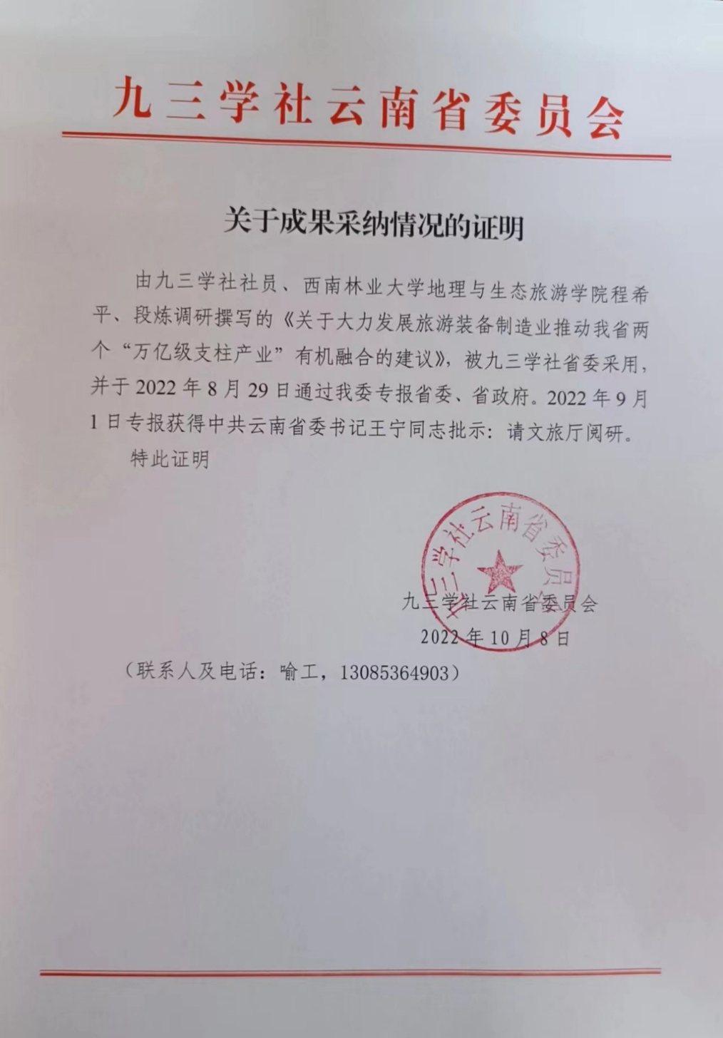近年来,地理与生态旅游学院持续加强研究成果的落地性与科研成果的转化性,已有6篇决策咨询报告获得省委领导的肯定性意见批示,为服务云南社会经济发展提供了决策参考。(来源:地理与生态旅游学院/图/文:段炼/审核:杨永发/复审:李福源/责任编辑:朱皓天)