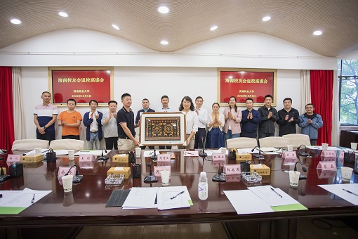 海南校友会会长吴维飞介绍海南校友会的基本情况。他表示,海南校友会的发展离不开母校的支持,希望全国各地的校友加强沟通合作,各地校友一起用心、用情、用力通过多种方式回报母校,与母校共同进步。座谈会上,吴维飞为学校和校友会赠送了具有海南特色的黎族织锦和校友会旗帜。