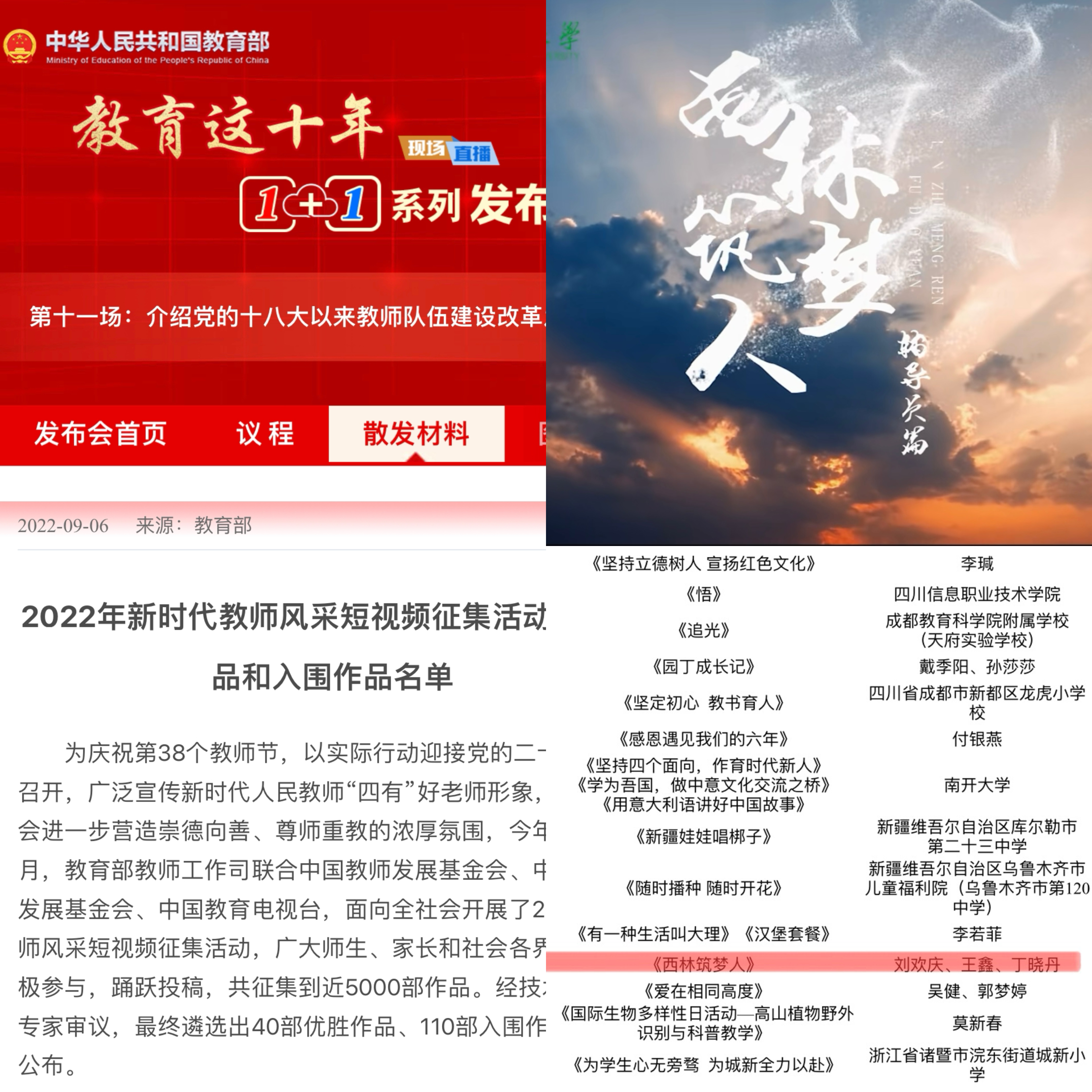 9月6日,教育部公布今年教师节的重点活动之一——2022年新时代教师风采短视频征集活动优胜作品和入围作品名单,米兰报送的《西林筑梦人》荣获入围作品。
