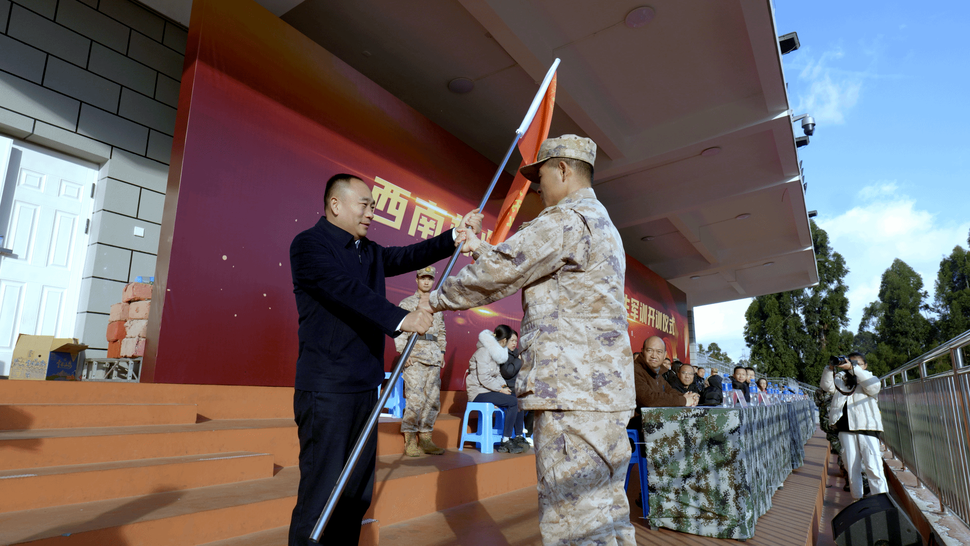 郭华向学生军训团授旗。