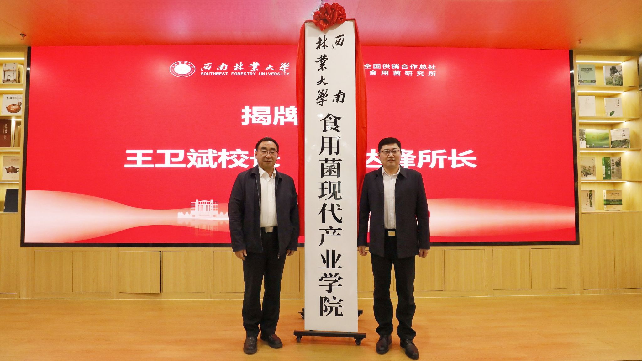 杨思林宣读了学校成立食用菌现代产业学院的决定,王卫斌和孙达锋共同为食用菌现代产业学院揭牌,杨思林和华蓉签署共建食用菌现代产业学院合作协议。大会还举行了共建单位赠书仪式。与会人员共同参观了食用菌现代产业学院实验室。