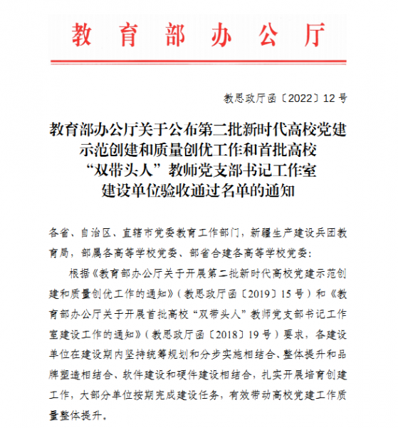 近日,教育部办公厅印发《关于公布第二批新时代高校党建示范创建和质量创优工作和首批高校“双带头人”教师党支部书记工作室建设单位验收通过名单的通知》,学校后勤服务集团第二党支部和材料科学与工程学院木材科学教学科研团队党支部通过教育部思想政治工作司第二批新时代高校党建示范创建和质量创优工作验收。