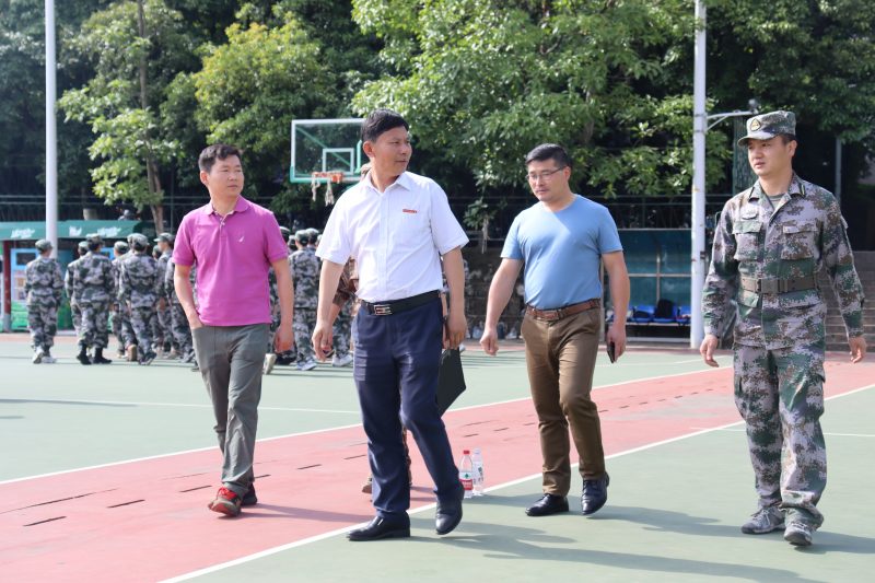 6月20日,米兰开展2021级学生军训工作,校党委副书记刘清江带领武装部部长杨绍辉、学生处副处长张德国和国防后备营营长李川视察新生军训工作进展情况,军训总教官肖玉春陪同视察。