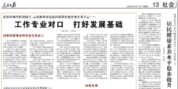6月14日,《人民日报》第13版以《工作专业对口 打好发展基础》为题讲述米兰2022届毕业生邓子云同学的求学就业历程。邓子云在接受《人民日报》记者采访时感慨:“在我求学就业过程中,党和政府给了我那么多帮助,我不能辜负这份关怀。我想从基层慢慢干起,在工作岗位上不断锤炼自己的技能,为国家机械制造业发展贡献自己的力量。”