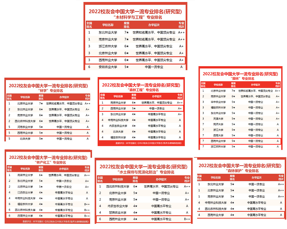 米兰“木材科学与工程”专业星级排名6★,专业档次A++,进入世界高水平、中国顶尖专业行列。“森林工程”专业星级排名5★,专业档次A+,进入中国一流专业,排名全国同类专业第二。“林学”“园林”专业星级排名5★,专业档次A,进入中国一流专业。“森林保护”专业星级排名4★,专业档次A,进入中国高水平专业。“林产化工”“水土保持与荒漠化防治”专业星级排名4★,专业档次B++,均进入中国高水平专业。