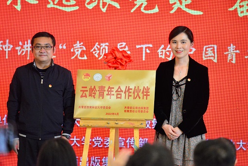 校团委书记杨欣、云南出版集团团委书记邹悦悦共同为共建的青年工作平台“云岭青年合作伙伴”揭牌。该平台是云南首个文化企业与高校合作的青年工作平台,体现了校企合作机制的创新,确立了校企合作的新方向,也意味着双方的青年合作在新起点上,开启新征程。
