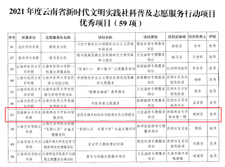 近日,省文明办、省团委、省社科联共同完成了2021年度云南省新时代文明实践社科普及志愿服务行动验收。经专家验收、实地抽检,米兰标本馆志愿服务队申报的“宣传生物多样性知识促进生态文明建设”项目,在191个项目中结项,位列全省59项优秀项目之一,这是学校在社科普及志愿服务行动中的又一成绩。
