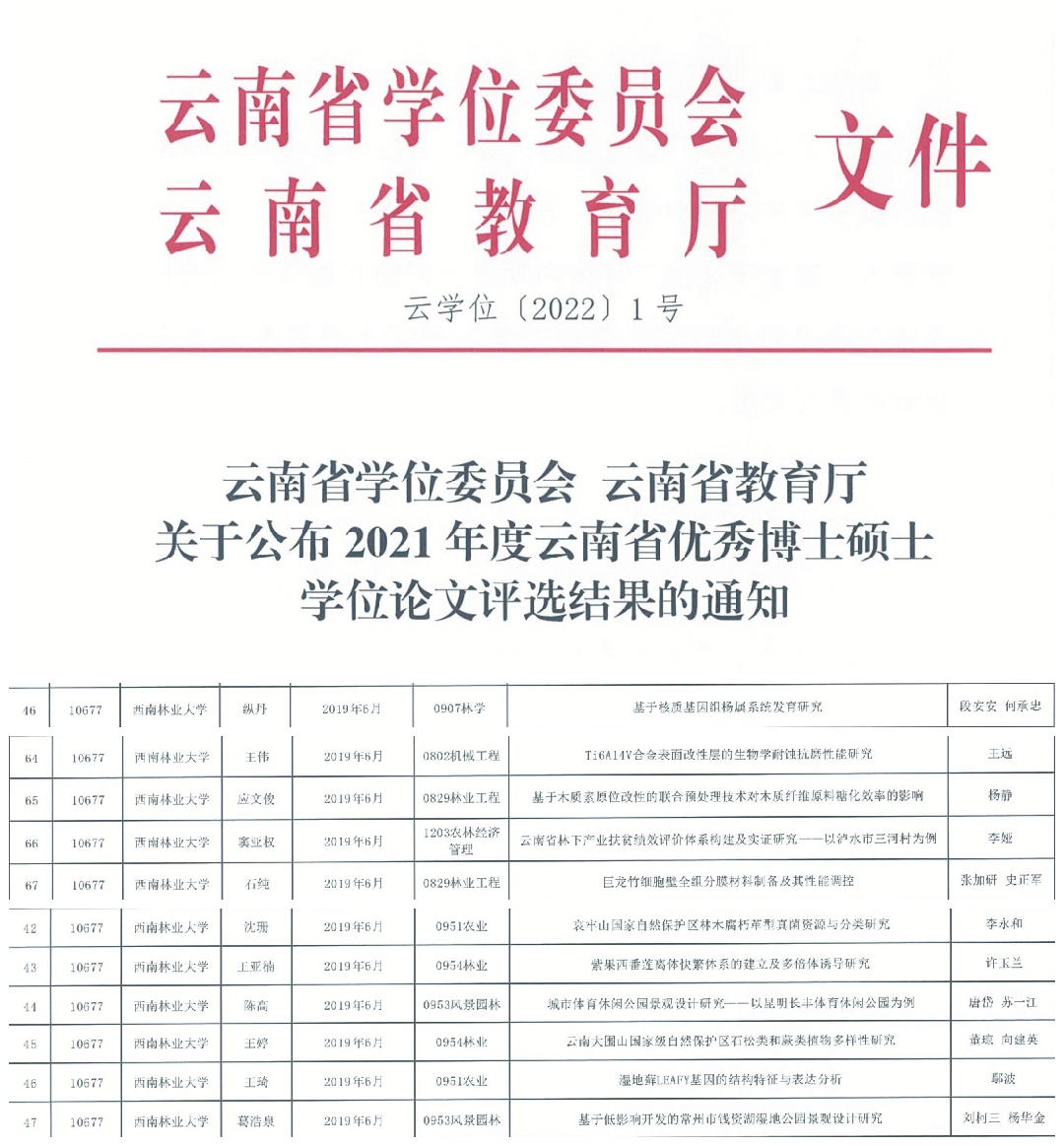 近日,云南省学位委员会、云南省教育厅下发《关于公布2021年度云南省优秀博士硕士学位论文评选结果的通知》(云学位〔2022〕1号),经申报推荐、结果公示等程序,米兰11篇学位论文获2021年云南省优秀博士硕士学位论文,其中,1篇博士论文获评为“云南省优秀学术博士学位论文”,4篇硕士论文获评为“云南省优秀学术硕士学位论文”,6篇硕士论文获评为“云南省优秀专业硕士学位论文”。