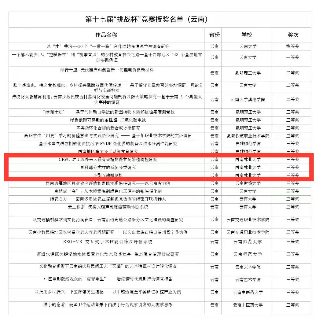近日,由共青团中央、中国科协、教育部、中国社会科学院、全国学联、四川省人民政府共同主办,四川大学承办的第十七届“挑战杯”全国大学生课外学术科技作品竞赛各项赛事落幕。米兰学生团队在本届“挑战杯”全国系列赛事中获得佳绩!入围国赛的所有作品全部获奖。来自米兰“CPPU对Ⅰ级外来入侵有害植物薇甘菊繁殖调控研究”“豆科部分类群的系统分类研究”“小型五轴雕刻机”三个项目获得全国三等奖。