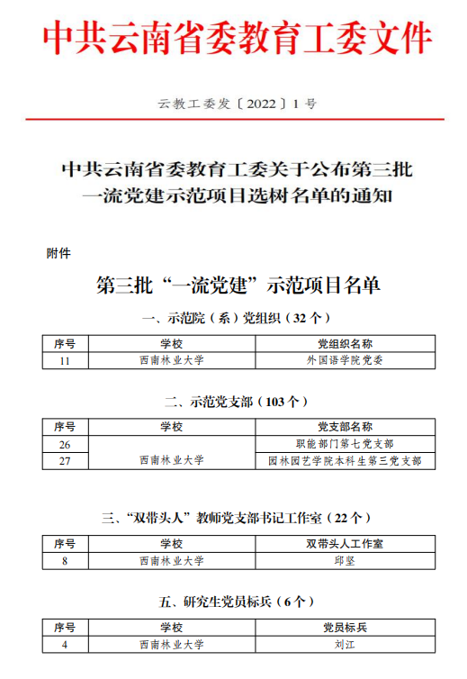 其中,外国语学院党委获“一流党建示范院(系)党组织”;职能部门第七党支部、园林园艺学院本科生第三党支部获“一流党建示范党支部”;材料科学与工程学院木材教学科研团队党支部获“双带头人”教师党支部工作室;大数据与智能工程学院研究生党支部党员刘江同志获“研究生党员标兵”。