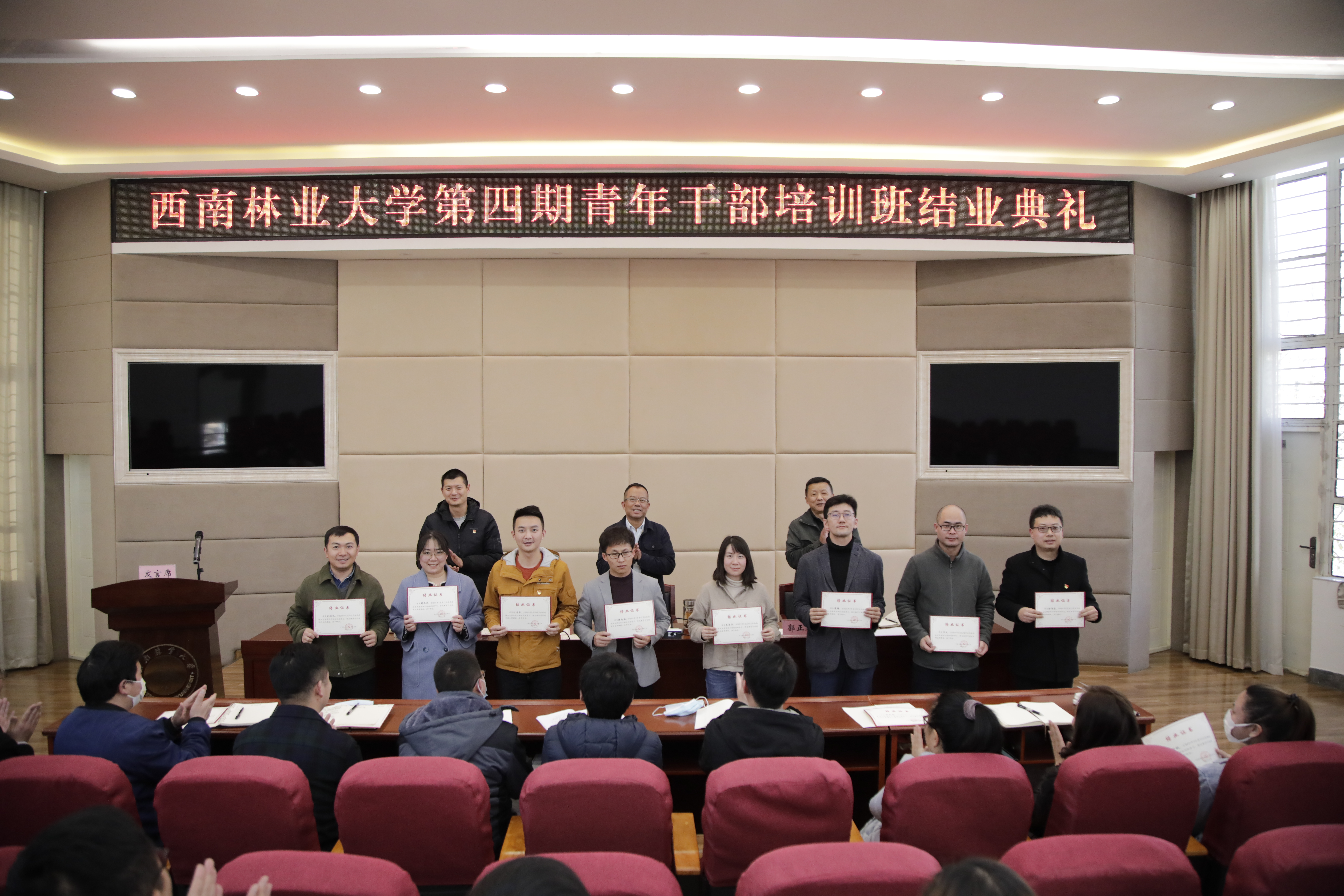 结业式上,办公室(党委巡察办)王欢、材料科学与工程学院徐开蒙、审计处王喆、文法学院潘昭宇4名同志代表中青班学员进行汇报发言。魏宏、郭正春、苏小冰为学员颁发了结业证书。